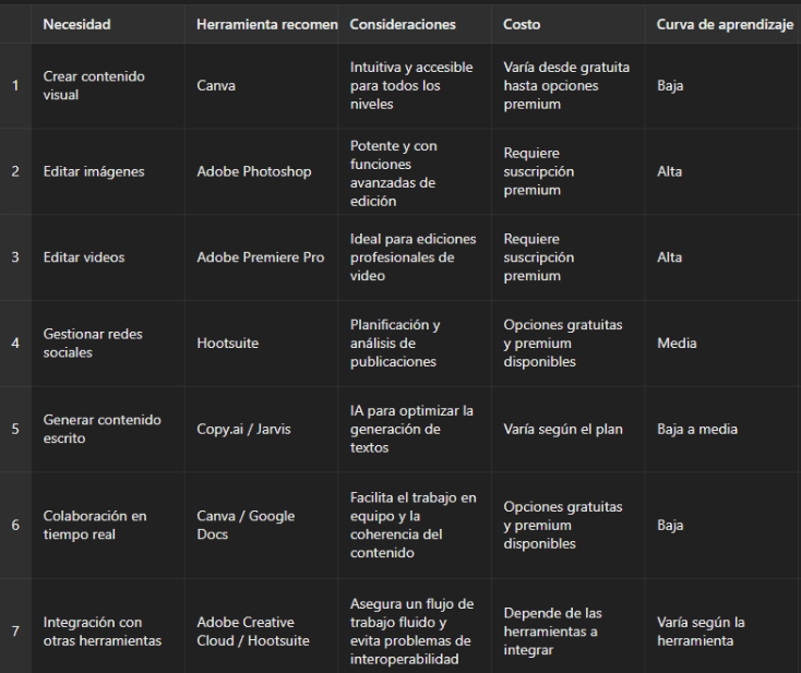 He creado un cuadro que muestra las diferentes necesidades que puedes tener al seleccionar herramientas de creación de contenido digital, junto con las herramientas recomendadas, consideraciones, costos y la curva de aprendizaje para cada una. Esto te ayudará a evaluar y tomar decisiones informadas sobre qué herramientas utilizar según tus objetivos y requisitos específicos.